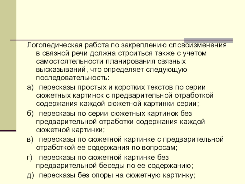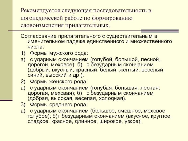 Слайд 175Рекомендуется следующая последовательность в логопедической работе по формированию словоизменения прилагательных.