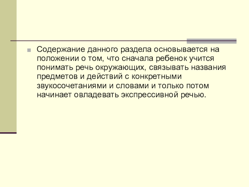 учится понимать речь окружающих, связывать названия предметов и действий с конкретными звукосочетаниями и словами и только потом начинает овладевать экспрессивной речью.