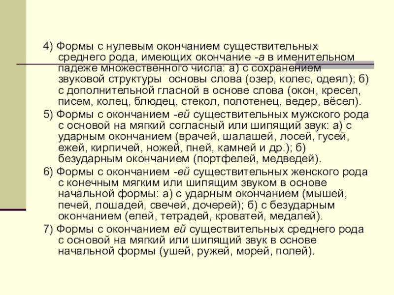 4) Формы с нулевым окончанием существительных среднего рода, имеющих окончание -а
