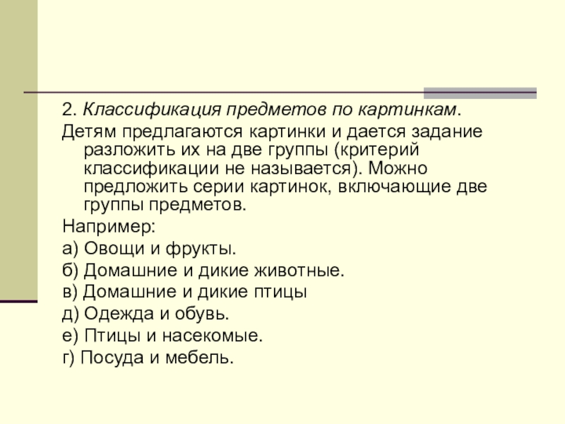 Лексические темы: «Помещение детского сада», «Одежда», «Обувь», «Посуда», «Фрукты», «Овощи», «Продукты питания», «Игрушки», «Осень», «Зима», «Праздник Новый год», «Развлечения детей в зимнее время» и т. д