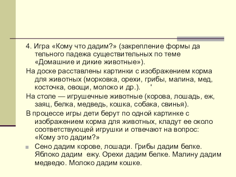 4. Игра «Кому что дадим?» (закрепление формы дательного падежа существительных по