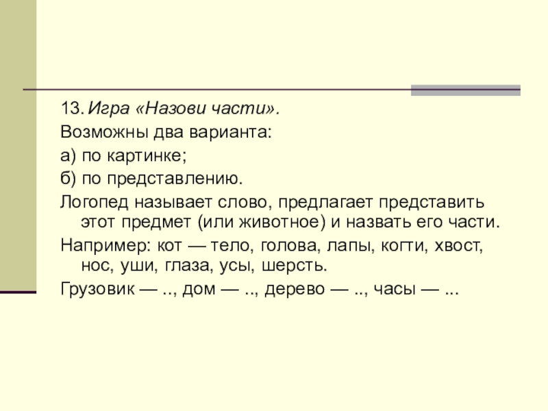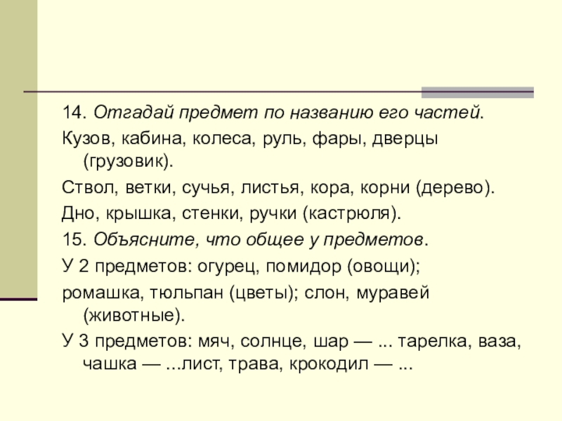 Логопед задает вопрос: «Что без чего?» Стул без ножки. Машина без колеса. Стул без спинки. Шуба без воротника. Кастрюля без ручки. Чайник без носика.