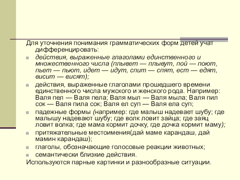 Для уточнения понимания грамматических форм детей учат дифференцировать: