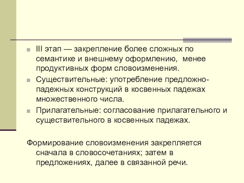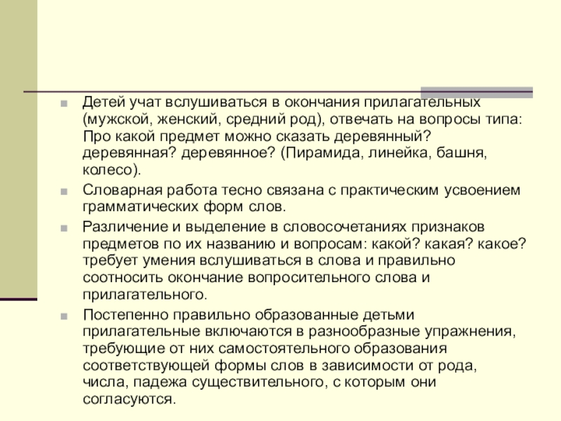 более поздние сроки, когда дети в основном овладели системой словоизменения существительных, так как прилагательные «принимают» то или иное грамматическое значение, ту или иную форму в зависимости от формы существительного.