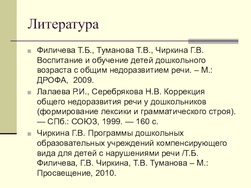 Чиркина Г.В. Программы дошкольных образовательных учреждений компенсирующего вида для детей с нарушениями речи /Т.Б. Филичева, Г.В. Чиркина, Т.В. Туманова – М.: Просвещение, 2010.