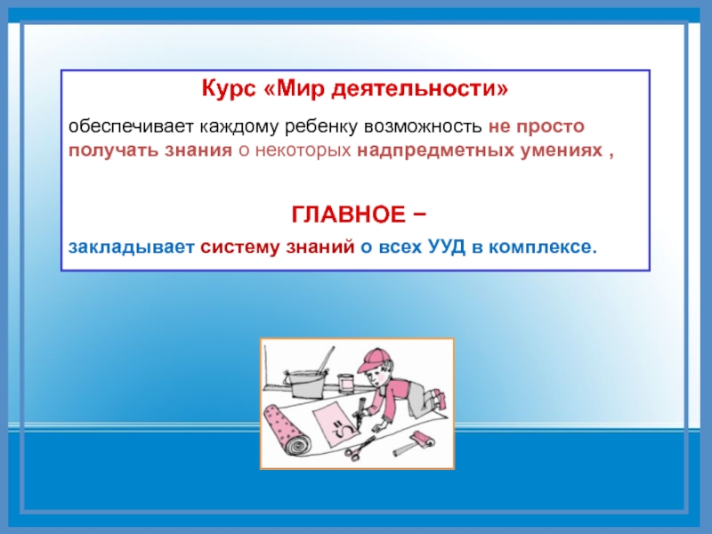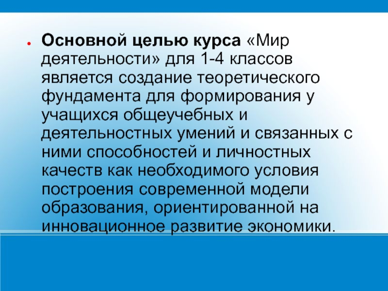 Слайд 5Основной целью курса «Мир деятельности» для 1-4 классов является создание теоретического