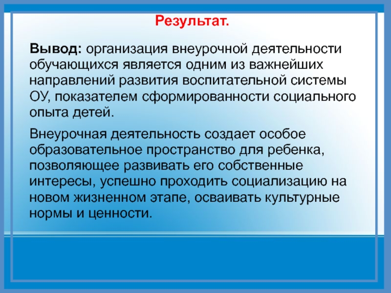 Вывод: организация внеурочной деятельности обучающихся является одним из важнейших направлений развития