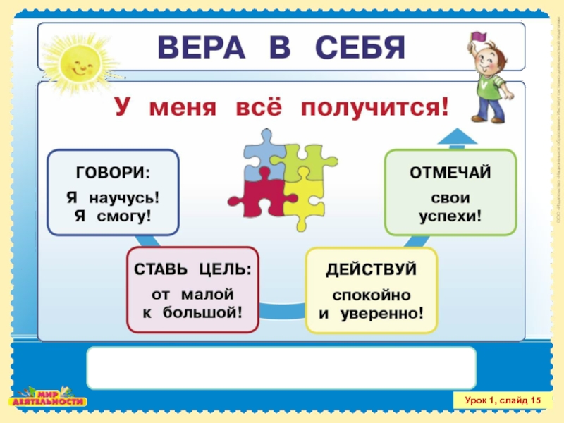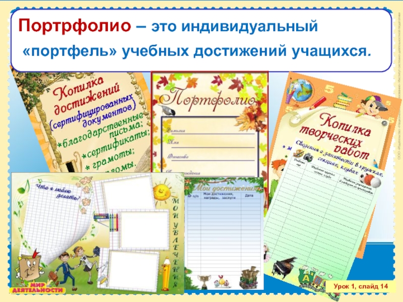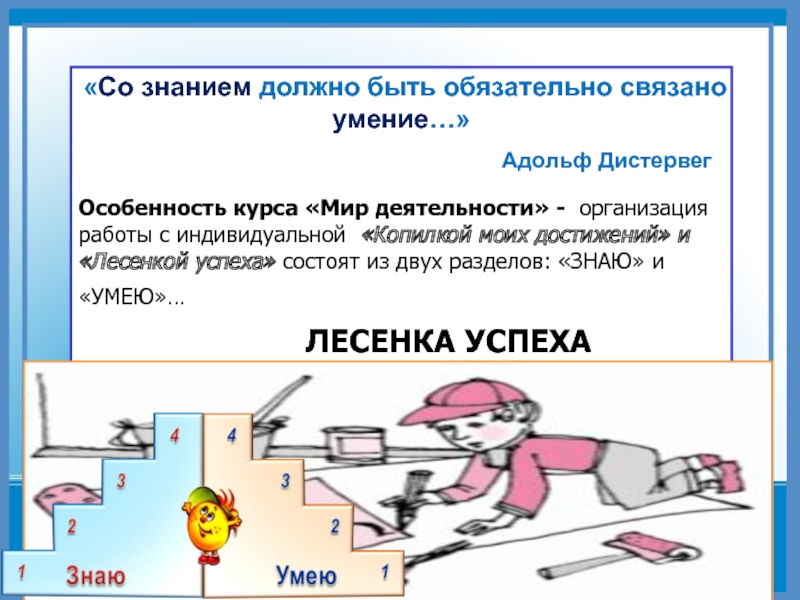 Особенность курса «Мир деятельности» - организация работы с индивидуальной «Копилкой моих достижений» и «Лесенкой успеха» состоят из двух разделов: «ЗНАЮ» и «УМЕЮ»…