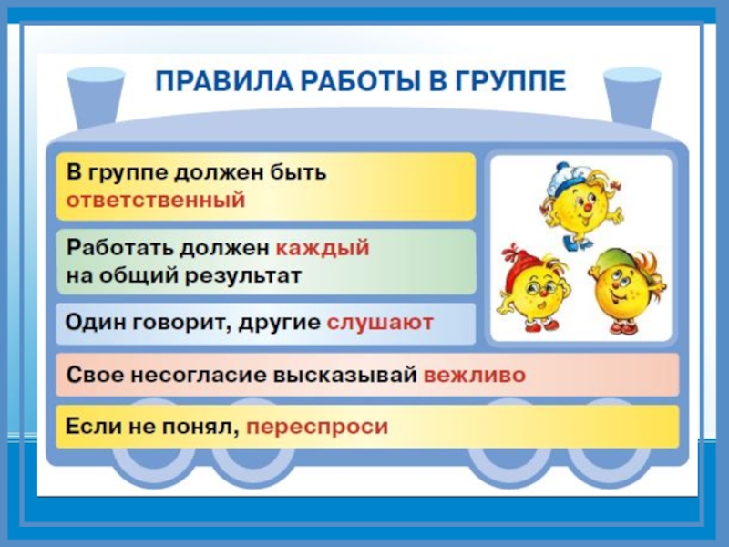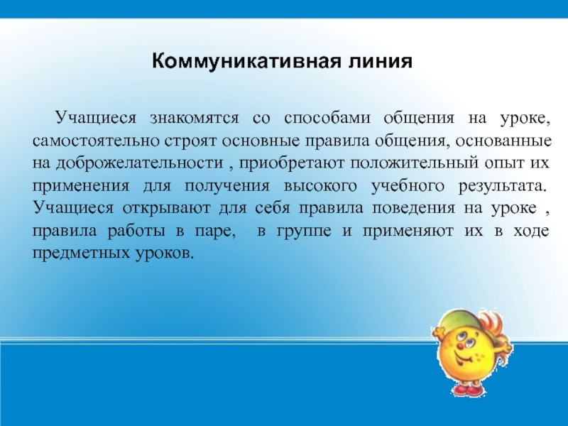 основные правила общения, основанные на доброжелательности , приобретают положительный опыт их применения для получения высокого учебного результата. Учащиеся открывают для себя правила поведения на уроке , правила работы в паре, в группе и применяют их в ходе предметных уроков.