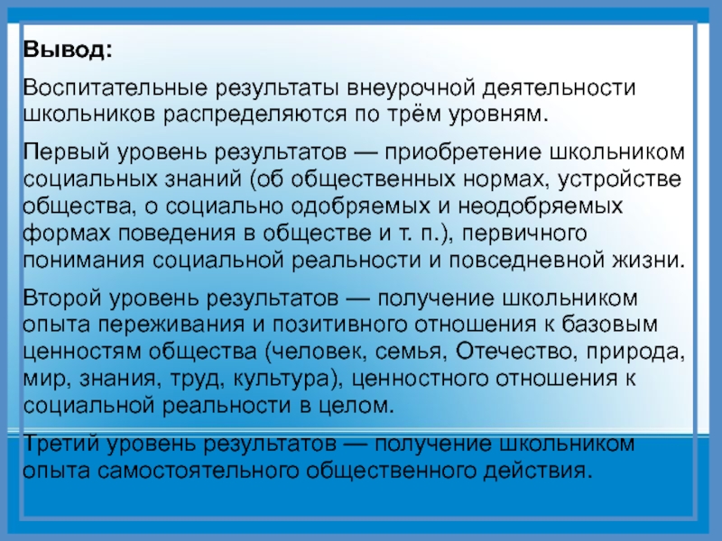Воспитательные результаты внеурочной деятельности школьников распределяются по трём уровням.