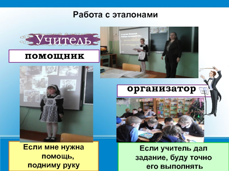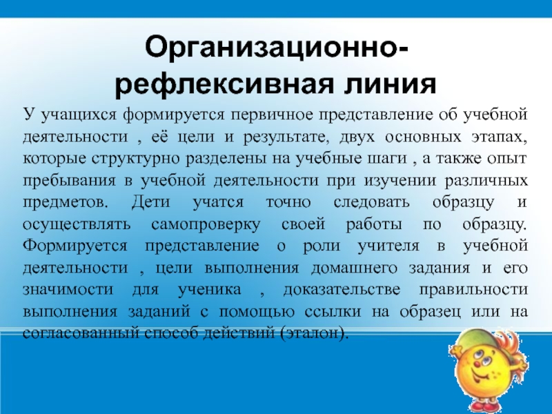 цели и результате, двух основных этапах, которые структурно разделены на учебные шаги , а также опыт пребывания в учебной деятельности при изучении различных предметов. Дети учатся точно следовать образцу и осуществлять самопроверку своей работы по образцу. Формируется представление о роли учителя в учебной деятельности , цели выполнения домашнего задания и его значимости для ученика , доказательстве правильности выполнения заданий с помощью ссылки на образец или на согласованный способ действий (эталон).