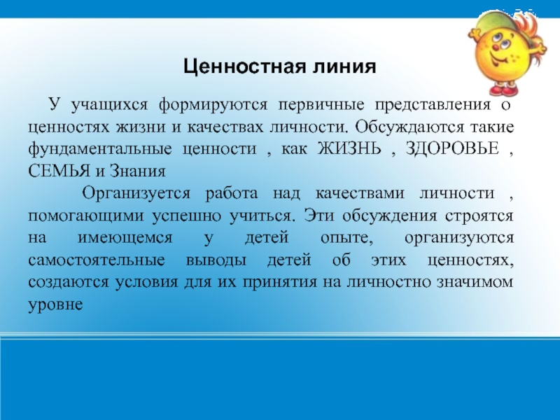 Организуется работа над качествами личности , помогающими успешно учиться. Эти обсуждения строятся на имеющемся у детей опыте, организуются самостоятельные выводы детей об этих ценностях, создаются условия для их принятия на личностно значимом уровне