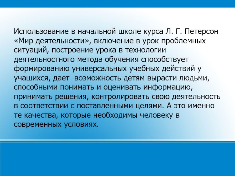 Слайд 33Использование в начальной школе курса Л. Г. Петерсон «Мир деятельности», включение