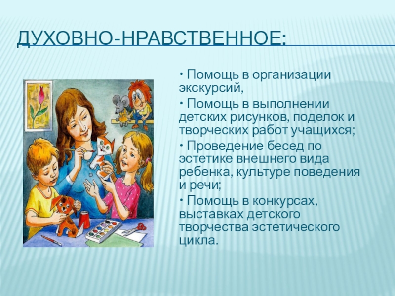 • Помощь в конкурсах, выставках детского творчества эстетического цикла.