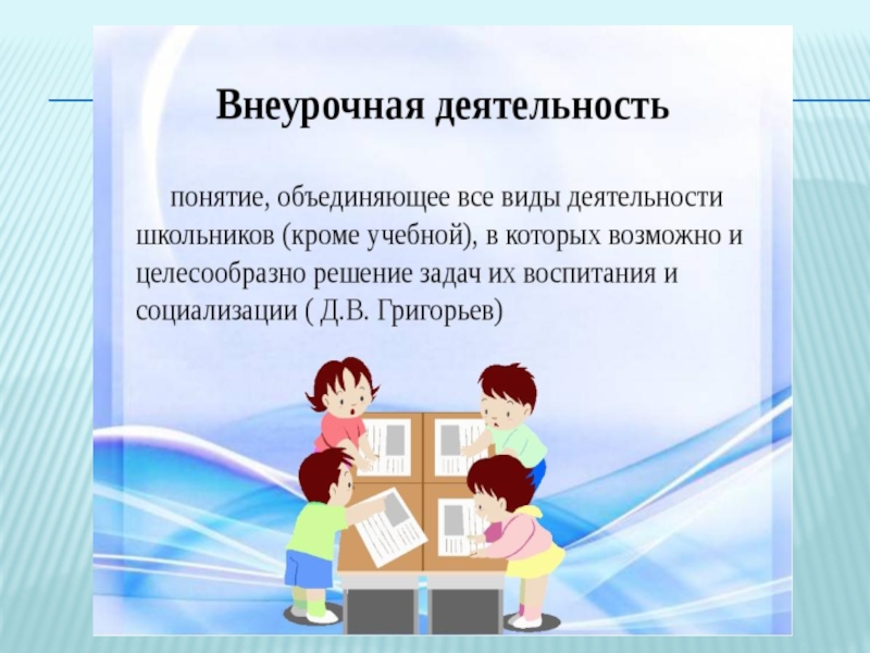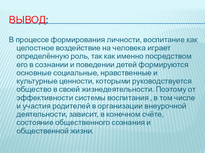 определённую роль, так как именно посредством его в сознании и поведении детей формируются основные социальные, нравственные и культурные ценности, которыми руководствуется общество в своей жизнедеятельности. Поэтому от эффективности системы воспитания , в том числе и участия родителей в организации внеурочной деятельности, зависит, в конечном счёте, состояние общественного сознания и общественной жизни.