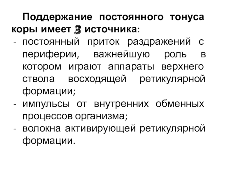 Слайд 11Поддержание постоянного тонуса коры имеет 3 источника: