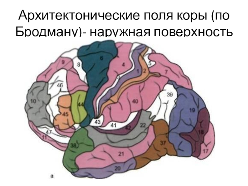 Слайд 17Архитектонические поля коры (по Бродману)- наружная поверхность