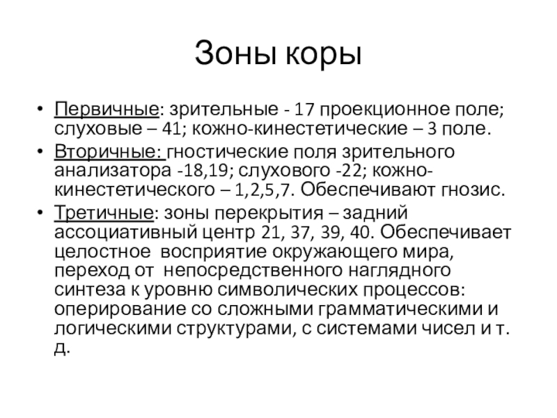 Вторичные – обеспечивают анализ и синтез разномодальных возбуждений, гностические виды психической деятельности.