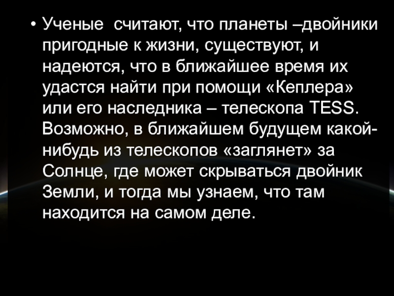 Слайд 37Ученые считают, что планеты –двойники пригодные к жизни, существуют, и надеются,