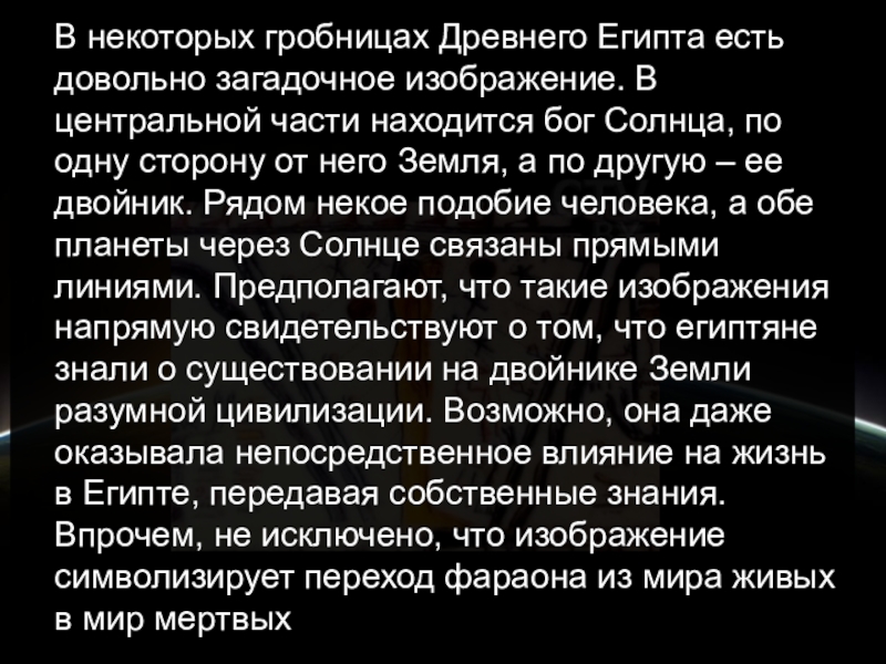 части находится бог Солнца, по одну сторону от него Земля, а по другую – ее двойник. Рядом некое подобие человека, а обе планеты через Солнце связаны прямыми линиями. Предполагают, что такие изображения напрямую свидетельствуют о том, что египтяне знали о существовании на двойнике Земли разумной цивилизации. Возможно, она даже оказывала непосредственное влияние на жизнь в Египте, передавая собственные знания. Впрочем, не исключено, что изображение символизирует переход фараона из мира живых в мир мертвых