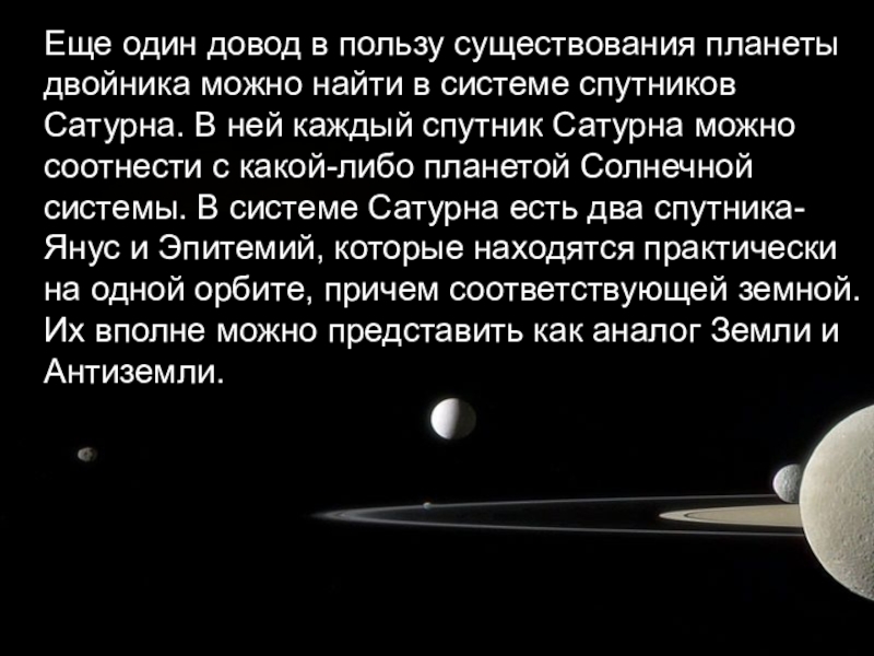системе спутников Сатурна. В ней каждый спутник Сатурна можно соотнести с какой-либо планетой Солнечной системы. В системе Сатурна есть два спутника- Янус и Эпитемий, которые находятся практически на одной орбите, причем соответствующей земной. Их вполне можно представить как аналог Земли и Антиземли.