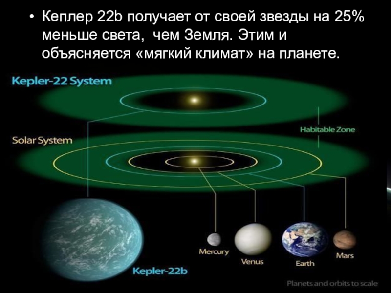 Слайд 35Кеплер 22b получает от своей звезды на 25% меньше света, чем