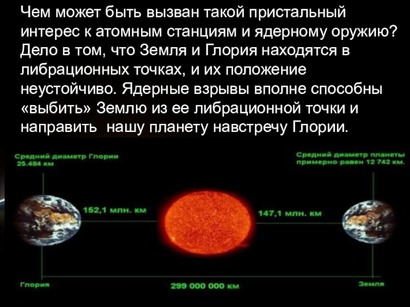 ядерному оружию? Дело в том, что Земля и Глория находятся в либрационных точках, и их положение неустойчиво. Ядерные взрывы вполне способны «выбить» Землю из ее либрационной точки и направить нашу планету навстречу Глории.