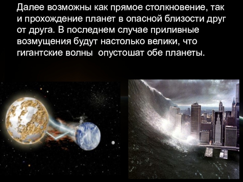 Слайд 30Далее возможны как прямое столкновение, так и прохождение планет в опасной