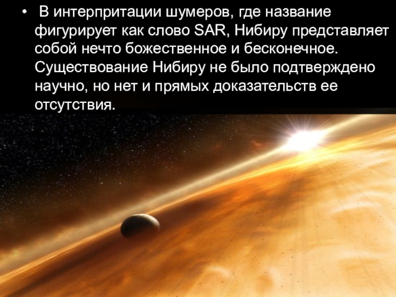 Слайд 24 В интерпритации шумеров, где название фигурирует как слово SAR, Нибиру