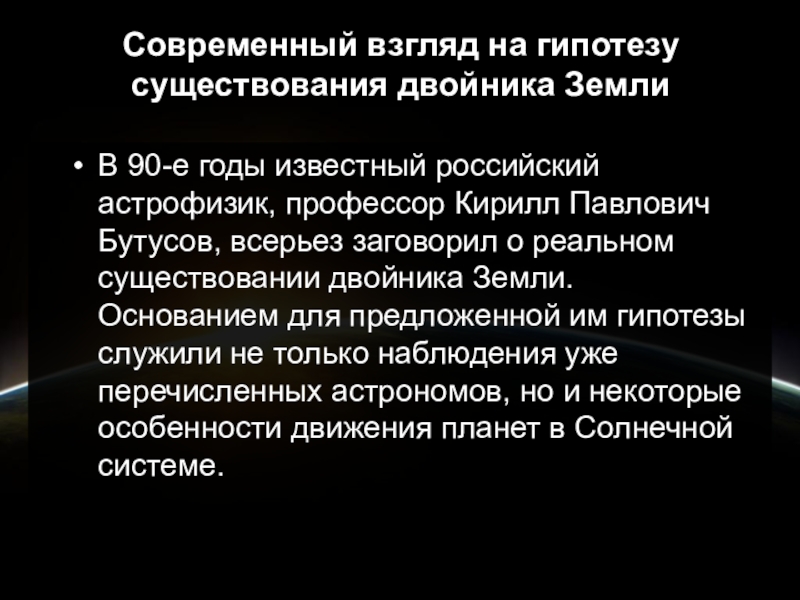 астрофизик, профессор Кирилл Павлович Бутусов, всерьез заговорил о реальном существовании двойника Земли. Основанием для предложенной им гипотезы служили не только наблюдения уже перечисленных астрономов, но и некоторые особенности движения планет в Солнечной системе.