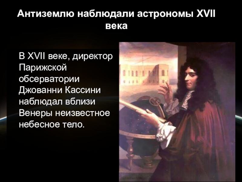 Слайд 13Антиземлю наблюдали астрономы XVII века
