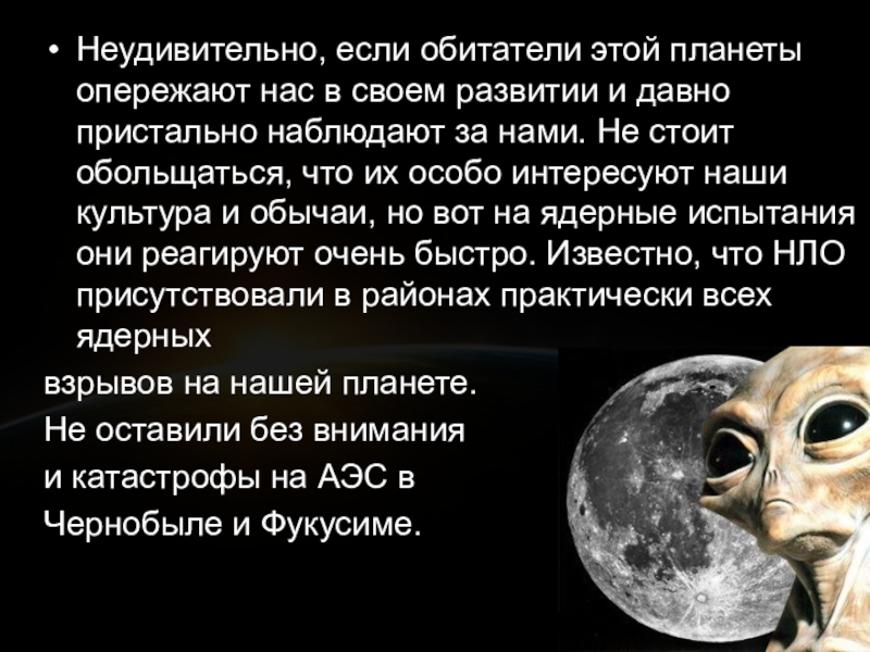 давно пристально наблюдают за нами. Не стоит обольщаться, что их особо интересуют наши культура и обычаи, но вот на ядерные испытания они реагируют очень быстро. Известно, что НЛО присутствовали в районах практически всех ядерных
