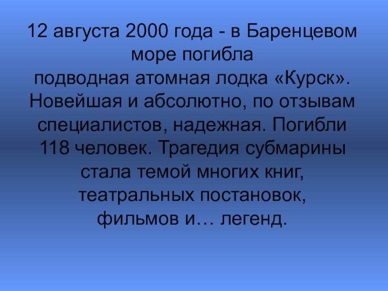 Слайд 4412 августа 2000 года - в Баренцевом море погибла