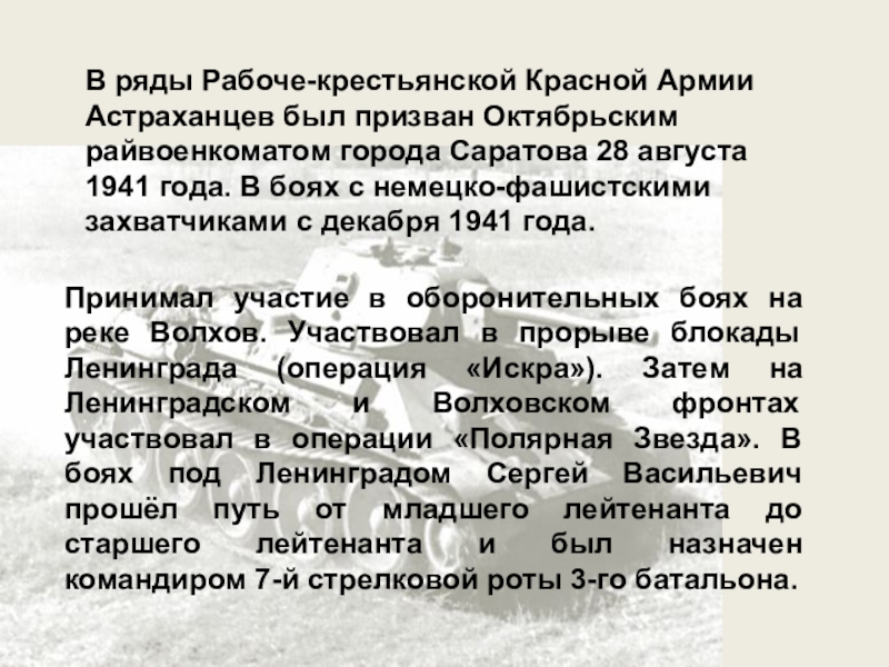 Принимал участие в оборонительных боях на реке Волхов. Участвовал в прорыве блокады Ленинграда (операция «Искра»). Затем на Ленинградском и Волховском фронтах участвовал в операции «Полярная Звезда». В боях под Ленинградом Сергей Васильевич прошёл путь от младшего лейтенанта до старшего лейтенанта и был назначен командиром 7-й стрелковой роты 3-го батальона.