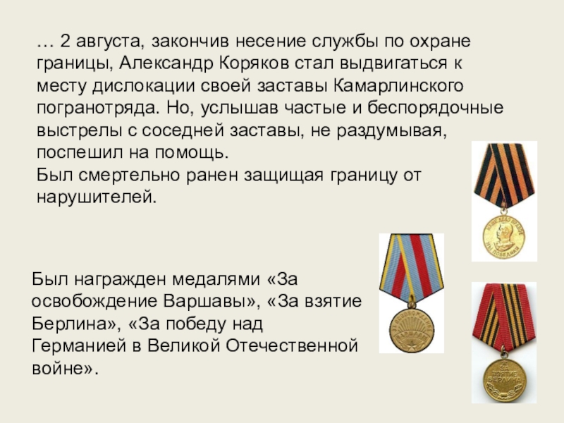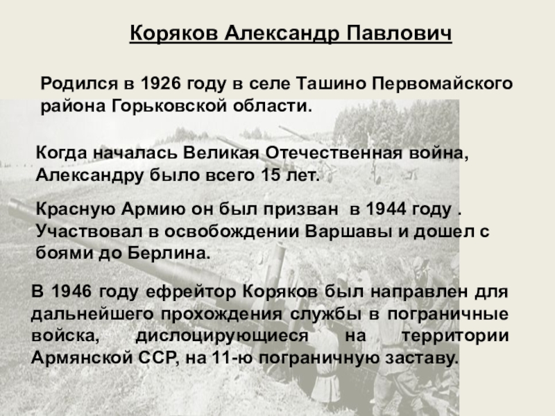 В 1946 году ефрейтор Коряков был направлен для дальнейшего прохождения службы в пограничные войска, дислоцирующиеся на территории Армянской ССР, на 11-ю пограничную заставу.
