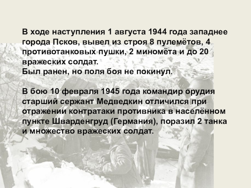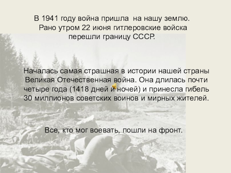 Началась самая страшная в истории нашей страны Великая Отечественная война. Она длилась почти четыре года (1418 дней и ночей) и принесла гибель 30 миллионов советских воинов и мирных жителей.