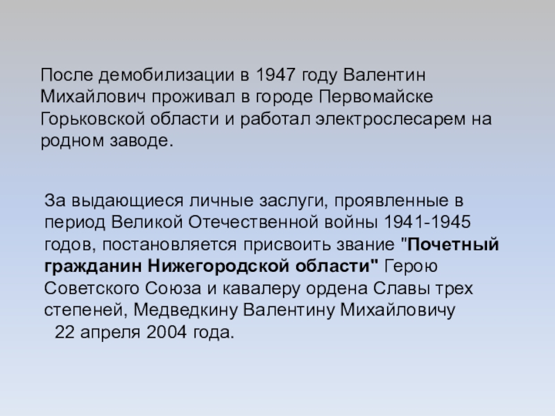 После демобилизации в 1947 году Валентин Михайлович проживал в городе Первомайске Горьковской области и работал электрослесарем на родном заводе.