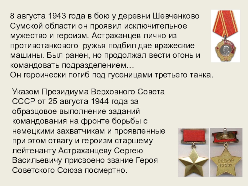 Указом Президиума Верховного Совета СССР от 25 августа 1944 года за образцовое выполнение заданий командования на фронте борьбы с немецкими захватчикам и проявленные при этом отвагу и героизм старшему лейтенанту Астраханцеву Сергею Васильевичу присвоено звание Героя Советского Союза посмертно.