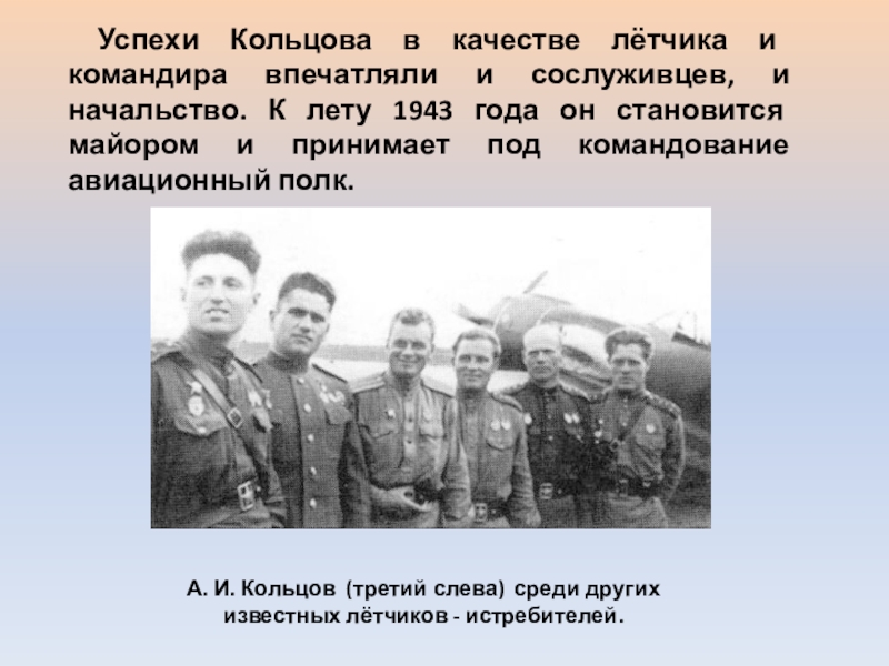 А. И. Кольцов (третий слева) среди других известных лётчиков - истребителей.