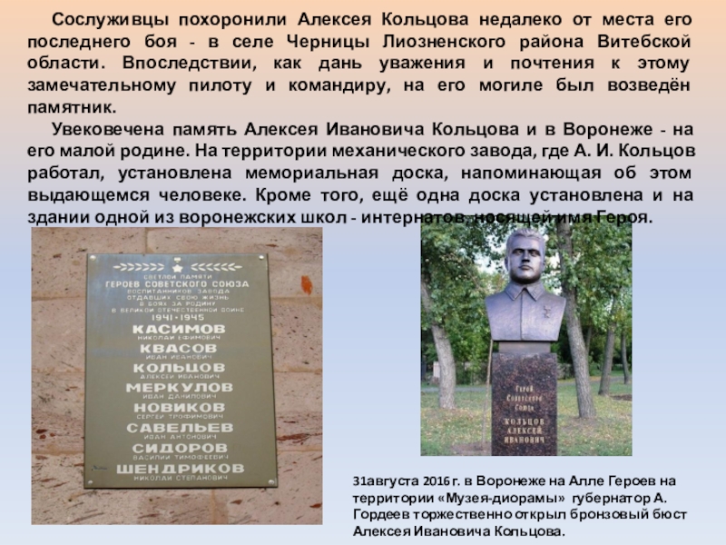 31августа 2016г. в Воронеже на Алле Героев на территории «Музея-диорамы» губернатор А.Гордеев торжественно открыл бронзовый бюст Алексея Ивановича Кольцова.