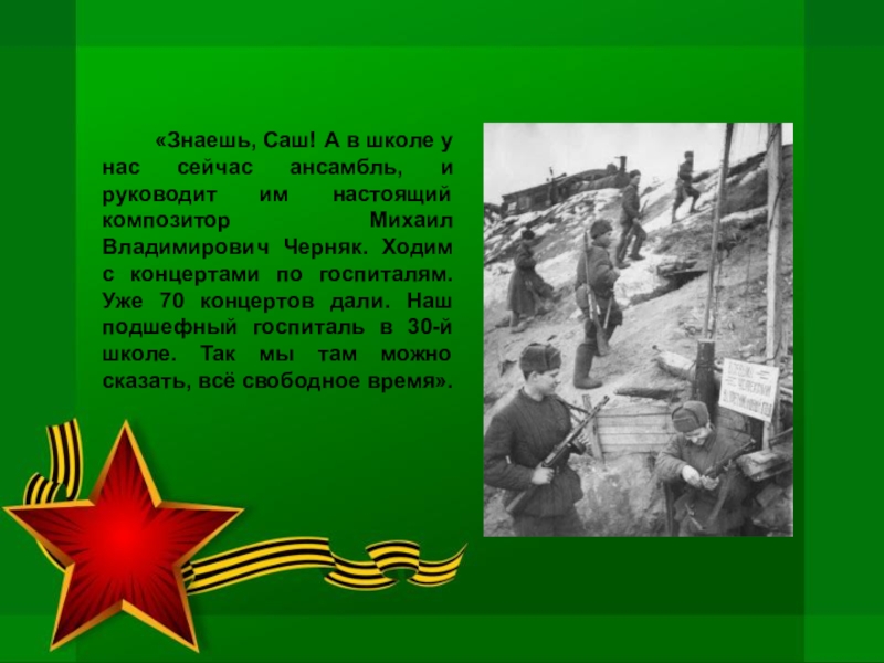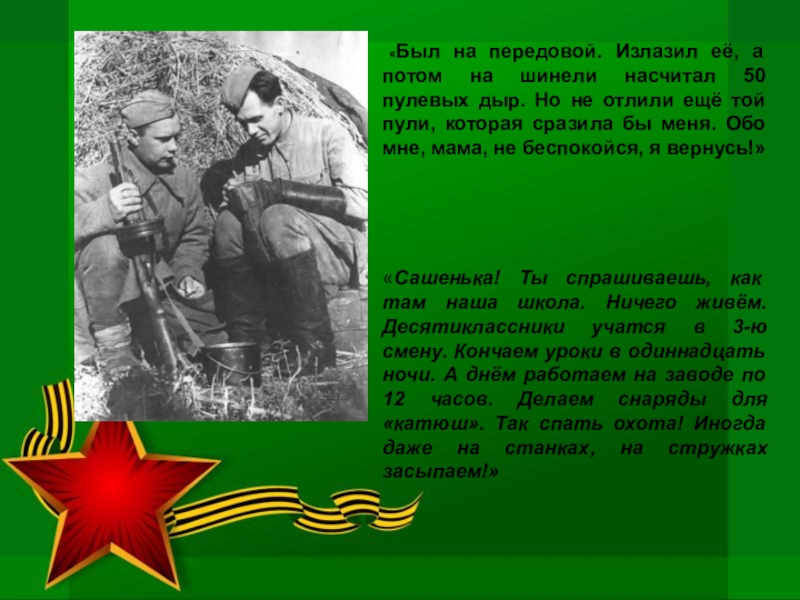 «Сашенька! Ты спрашиваешь, как там наша школа. Ничего живём. Десятиклассники учатся в 3-ю смену. Кончаем уроки в одиннадцать ночи. А днём работаем на заводе по 12 часов. Делаем снаряды для «катюш». Так спать охота! Иногда даже на станках, на стружках засыпаем!»