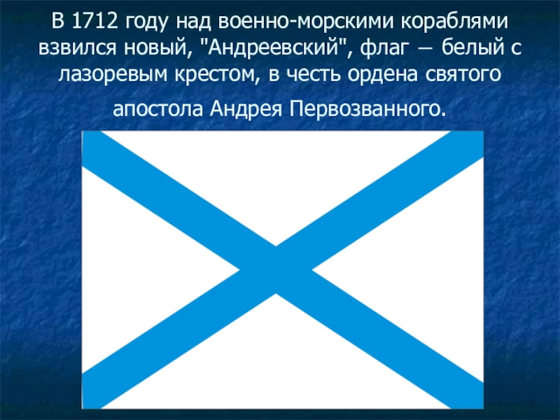 Слайд 25В 1712 году над военно-морскими кораблями взвился новый, "Андреевский", флаг ―