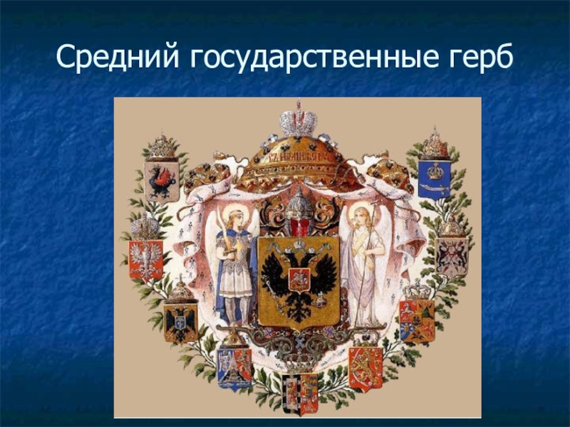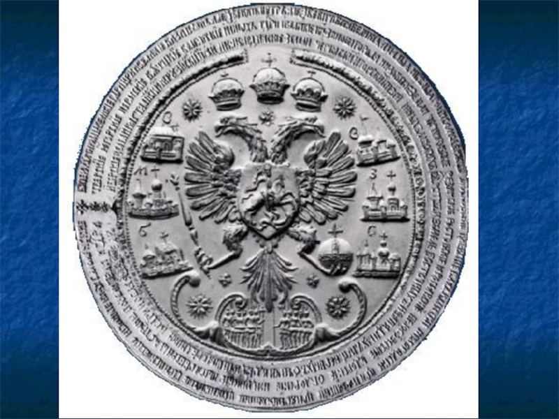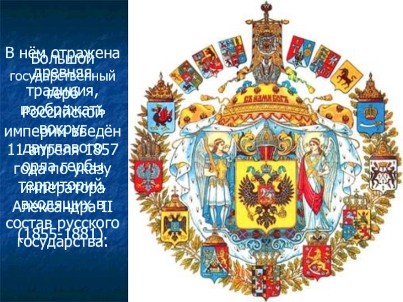 В нём отражена древняя традиция, изображать вокруг двуглавого орла гербы территорий, входящих в состав русского государства.