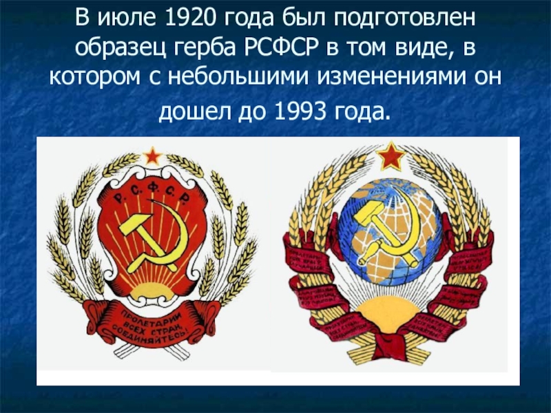 Слайд 20В июле 1920 года был подготовлен образец герба РСФСР в том