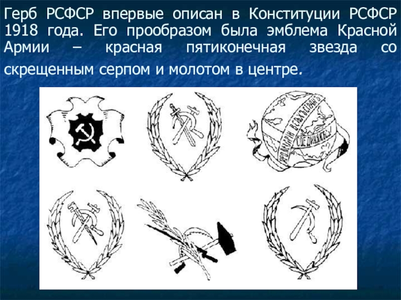 Слайд 19Герб РСФСР впервые описан в Конституции РСФСР 1918 года. Его прообразом