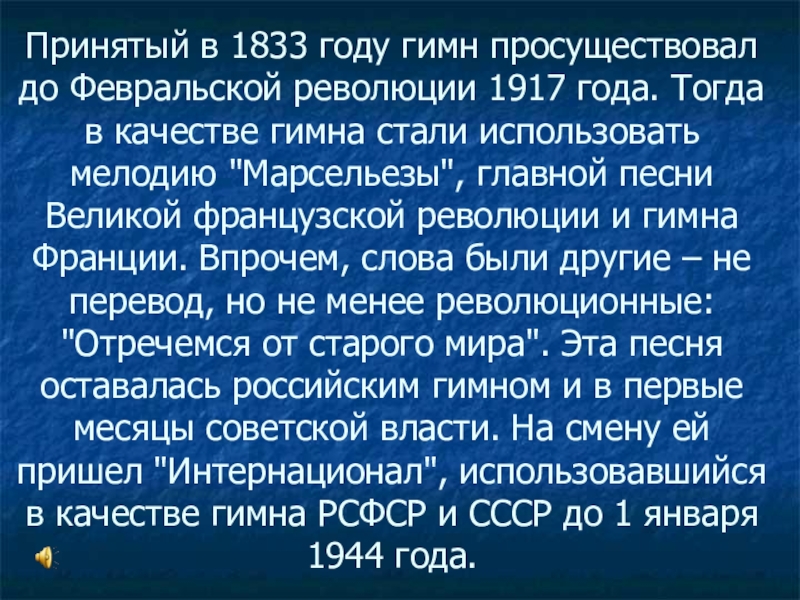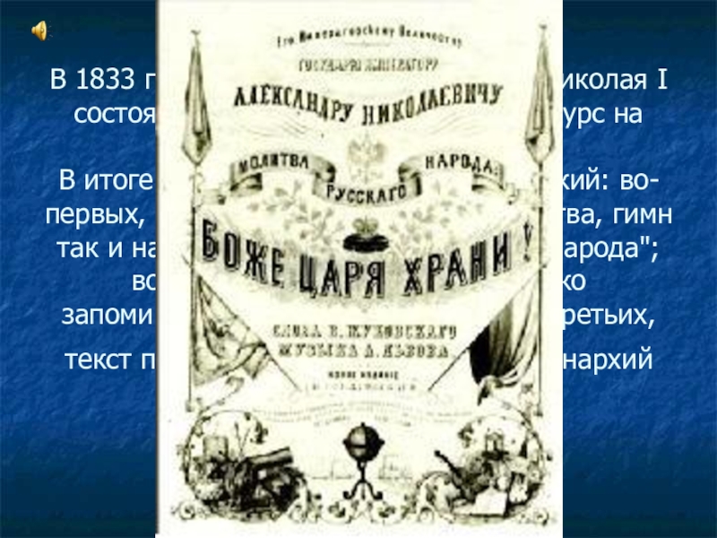 Слайд 34Принятый в 1833 году гимн просуществовал до Февральской революции 1917 года.