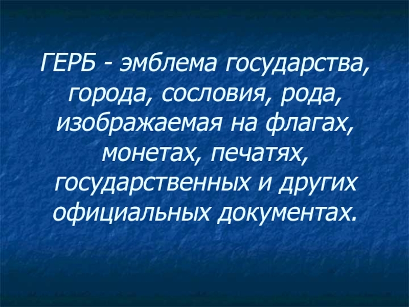 Слайд 12ГЕРБ - эмблема государства, города, сословия, рода, изображаемая на флагах, монетах,