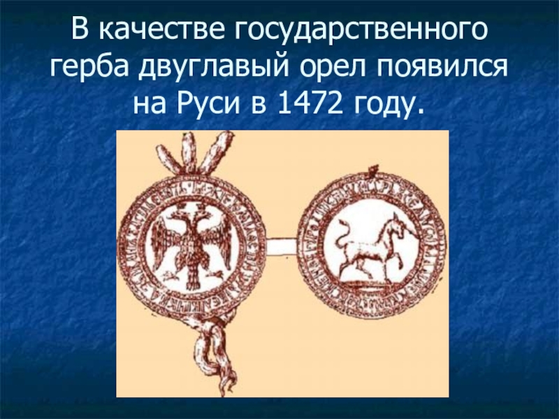 Слайд 13В качестве государственного герба двуглавый орел появился на Руси в 1472
