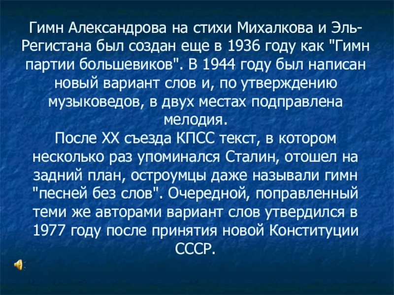 Слайд 36Гимн Александрова на стихи Михалкова и Эль-Регистана был создан еще в