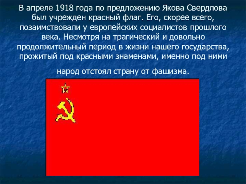 Слайд 28В апреле 1918 года по предложению Якова Свердлова был учрежден красный